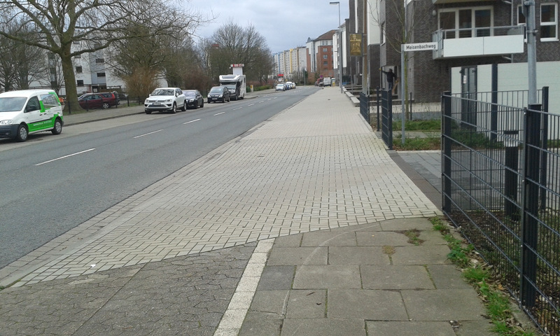 An der Einfahrt zum Meisenbartweg endet der Radweg; es ist nur noch ein Gehweg vorhanden.